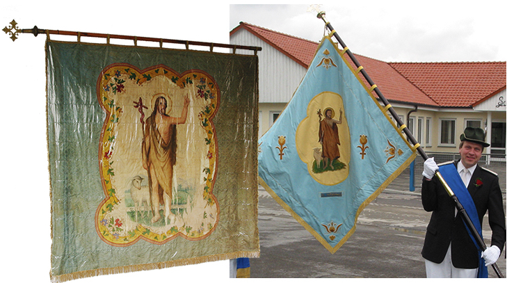 Die heutige Fahne zeigt wieder beide Seiten – mit Johannes dem Täufer und dem Hubertus-Hirsch.